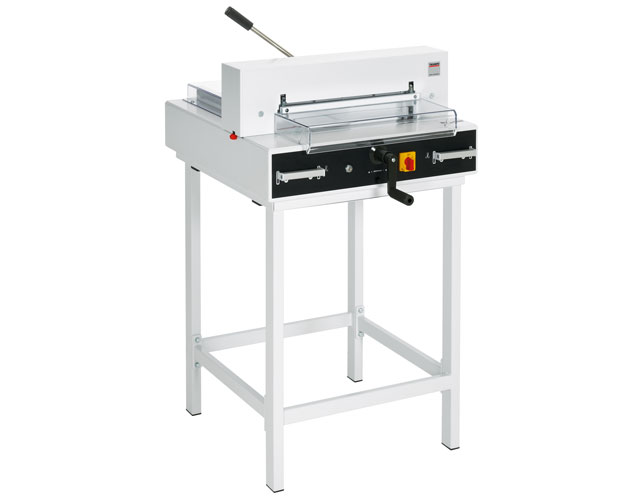 Electric blade drive. Spindle-guided back gauge with calibrated crank. Front table digital display (cm or inches) for precise back gauge positioning. Bright, LED optical cutting line. Patented lever-activated, fast-action clamp. Precision side guide. High quality, German steel blade. Solid steel blade carrier and adjustable blade guides. All-metal construction. Optional stand (shown above), or cabinet with storage shelves. UL and C UL approved.