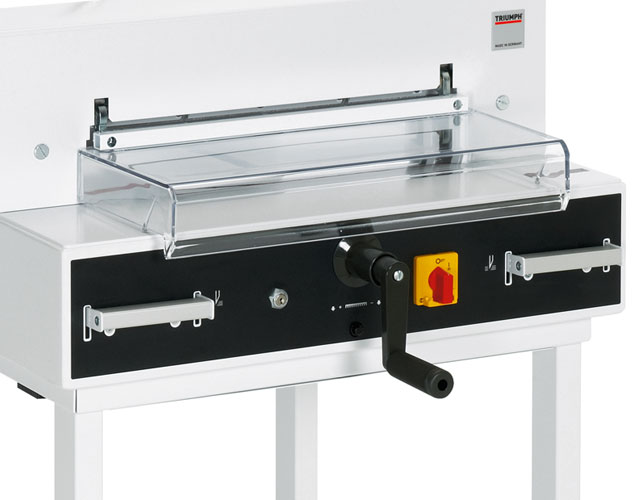 Comprehensive SCS safety package: patented EASY CUT electronic blade activation bars for true two-hand operation; transparent, electronically controlled front safety guard; transparent safety cover on rear table; main switch and safety lock with key; 24 volt controls (low voltage); patented IDEAL safety drive; automatic blade return from every position; disc brake for instant blade stop; blade changing device covers cutting edge of blade; blade depth adjustment from outside of machine; blade and cutting stick can be changed without removing covers.