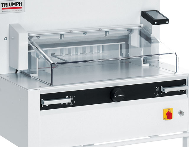 Ergonomic, 37 inch working height. Electric blade and clamp drive. Electric back gauge drive with touchpad for easy programming. Digital measurement display (cm or inches) with multilingual operator guidance, accurate to 1/10 mm or 1/100 inch. Stores 99 programs with up to 99 steps in each (up to 15 repeat cuts can be integrated as a single step). Pre-programmed for standard paper sizes. Memory key for repeat cuts.