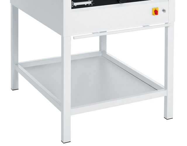 Automatic SET function for reference measurement and EJECT function for pushing out paper. Self-diagnostic system with error indication on display. Electronic hand wheel with variable speed control for manual back gauge setting. Bright, LED optical cutting line. Adjustable, spindle guided back gauge with narrow separations and plastic gliders. Dual side guides on front and rear tables. High quality, German steel blade. Solid steel blade carrier and adjustable blade guides. All-metal construction. Includes stand with storage shelf, easy-access tool holder, and paper blocking tool. Optional side tables increase work surface. UL and C UL approved.