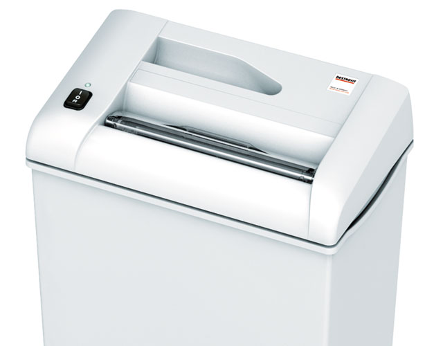Transparent safety shield in the feed opening. Automatic power cut-off when shredder head unit is removed from impact-resistant plastic shred bin (cross-cut model). Double protection against overheating. Automatic start and stop controlled by photo cell. Multifunction control switch with pilot light.