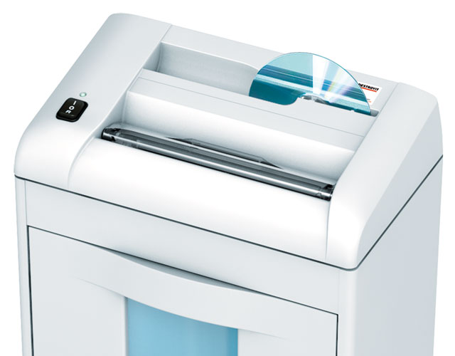 Two separate cutting heads with separate feed openings—one for paper and one for CDs / DVDs. Removable shred bin contains separate compartments for easy material separation and disposal. Window in shred bin shows fill level. Transparent safety shield in the feed opening.