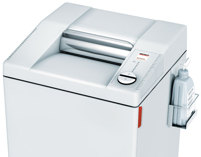 Comprehensive SPS safety package: Easy Switch control element uses illuminated color codes and symbols to indicate operational status and functions as an emergency stop switch; patented, electronically controlled, transparent safety shield in the feed opening; automatic power cut-off when cabinet is opened or shred bin is full; automatic reverse and power cut-off when overfed; double protection against overheating; Zero Energy Consumption sleep mode cuts off power supply after 30 minutes of inactivity.