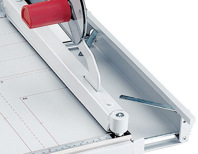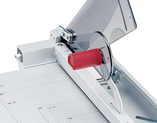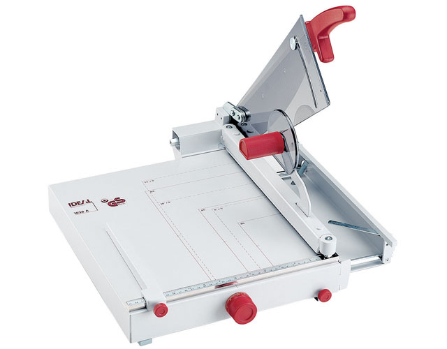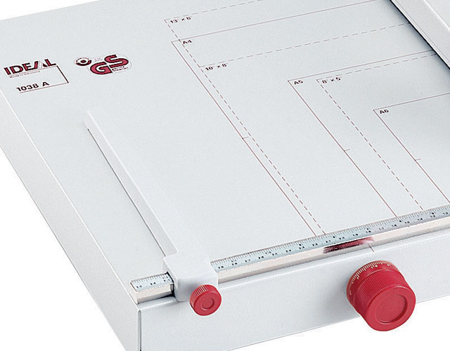 The overall table size for the 1038 is 16" x 14 1/4". The Kutrimmer 1038 has an independent manual clamp, lockable back gauge, precision side guides, all metal construction and a clear safety guard to protect the operator by covering the blade in any position. The Kutrimmer 1038 also features a fold away paper support for trimming oversized documents. Manufactured in Germany by MBM's parent company, IDEAL, Kutrimmer paper trimmers are built to the same exacting tolerances as Triumph cutters.