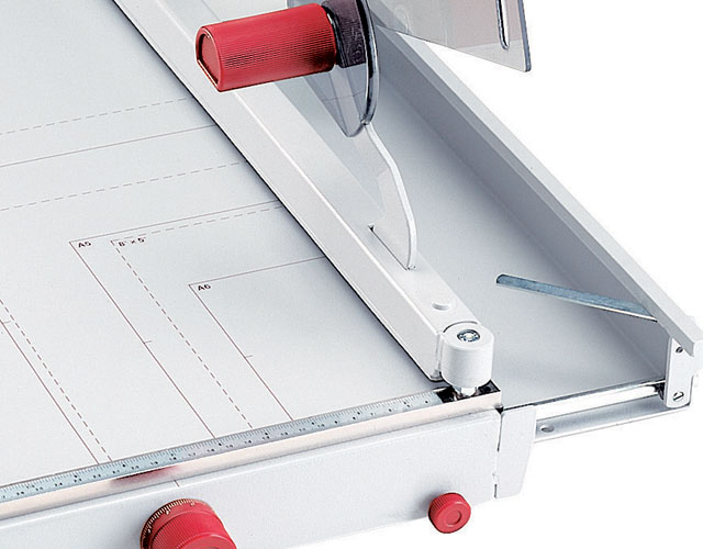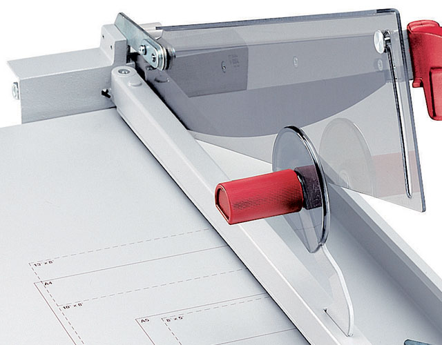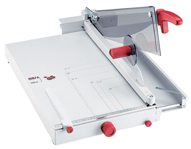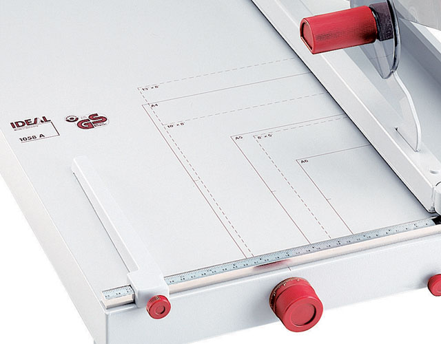 The overall table size for the 1058 is 24 1/4" x 14 1/4". The Kutrimmer 1058 has an independent manual clamp, lockable back gauge, adjustable front gauge, precision side guides, all metal construction and a clear safety guard to protect the operator by covering the blade in any position. Manufactured in Germany by MBM's parent company, IDEAL, Kutrimmer paper trimmers are built to the same exacting tolerances as Triumph cutters.