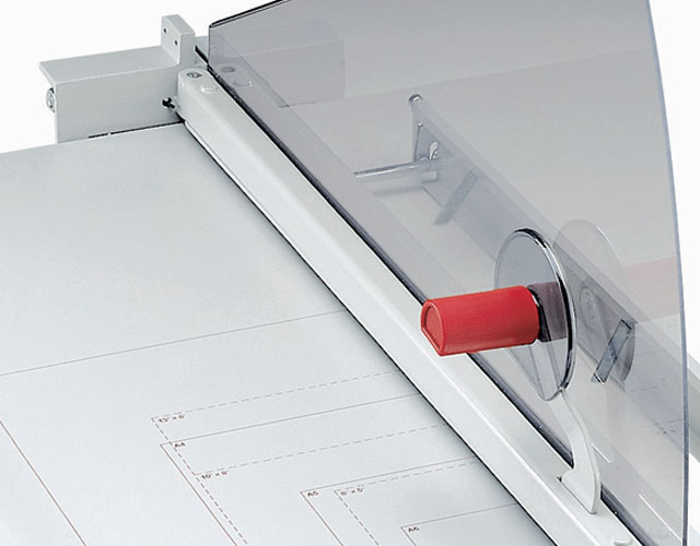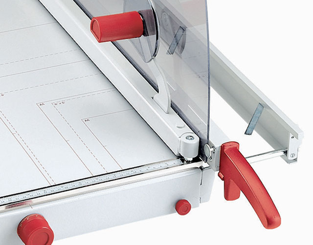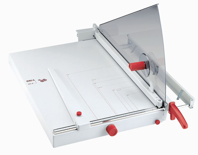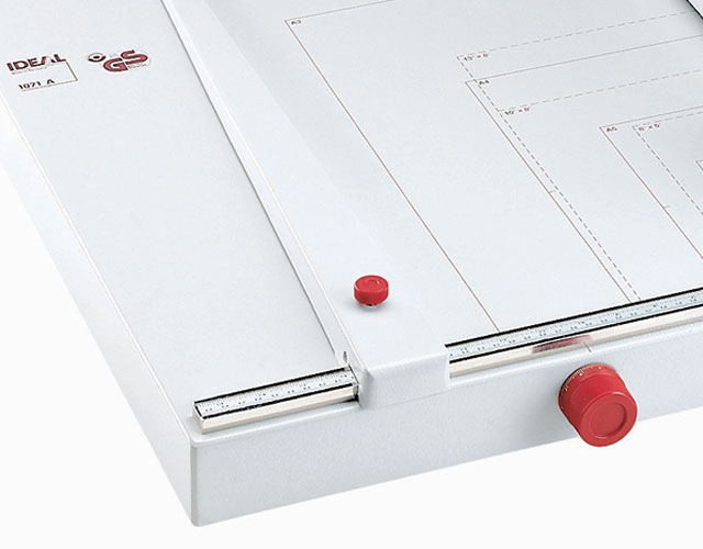The overall table size for the 1071 is 30 5/8" x 20 1/4". The Kutrimmer 1071 has an independent manual clamp, lockable back gauge, adjustable front gauge, precision side guides, all metal construction and a clear safety guard to protect the operator by covering the blade in any position. The Kutrimmer 1071 also features a fold away paper support for cutting oversize documents. Manufactured in Germany by MBM's parent company, IDEAL, Kutrimmer paper trimmers are built to the same exacting tolerances as Triumph cutters.