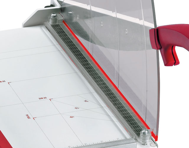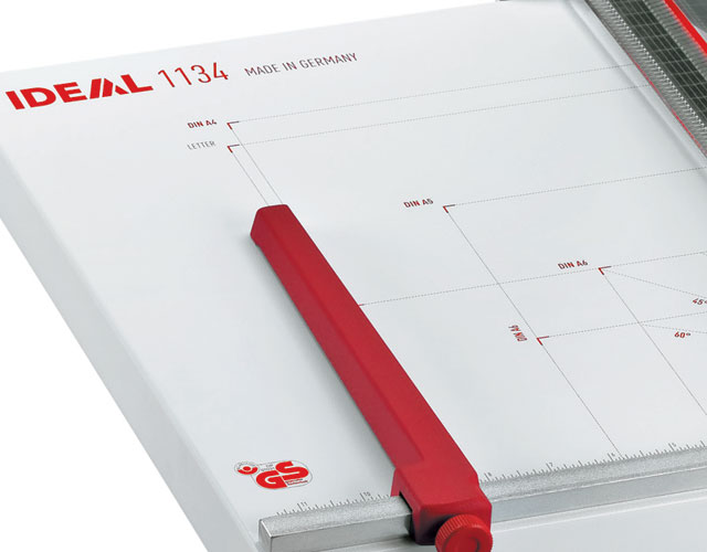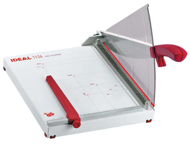 The overall table size for the 1134 is 15" x 12". The Kutrimmer 1134 has an independent manual clamp, lockable back gauge, precision side guides, all metal construction and a clear safety guard to protect the operator by covering the blade in any position. Manufactured in Germany by MBM's parent company, IDEAL, Kutrimmer paper trimmers are built to the same exacting tolerances as Triumph cutters.
